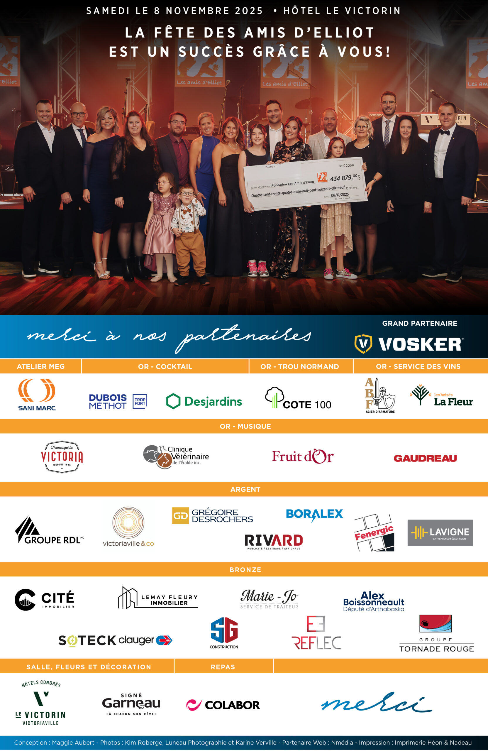 Exceptionnelle cette année 2025 qui a mené à une récolte de tout près de 435 000 $, montant qui a été dévoilé lors du récent souper gastronomique, l’une des principales activités avec la classique de golf et son magot de 152 000 $. “Le souper affichait complet avec 400 convives, se réjouit Jérôme Tardif. Une super belle soirée où l’on a fait danser la troupe des amis d’Elliot. Les enfants de Catherine et de Yan se sont aussi impliqués dans l’animation.” La soirée se déroulait justement sous le thème »Par et pour les enfants ».